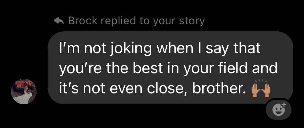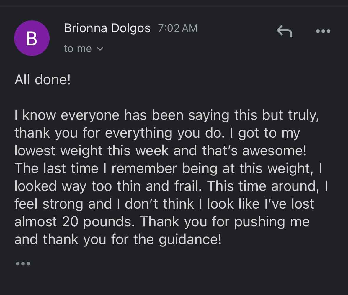 “Thank you so much. Honestly, without you I wouldn’t be so motivated to have even made my fitness account. I’m so grateful for how much you’ve changed me – not only physically, but mentally. Best in the game. I wish this had happened sooner. You changed my life.”